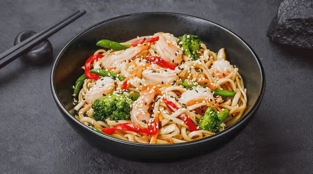Завершує гастрономічну картину локшина удон з креветками. Товста пшенична локшина поєднується з морепродуктами, овочами та ароматними соусами. Страва виходить поживною та насиченою.